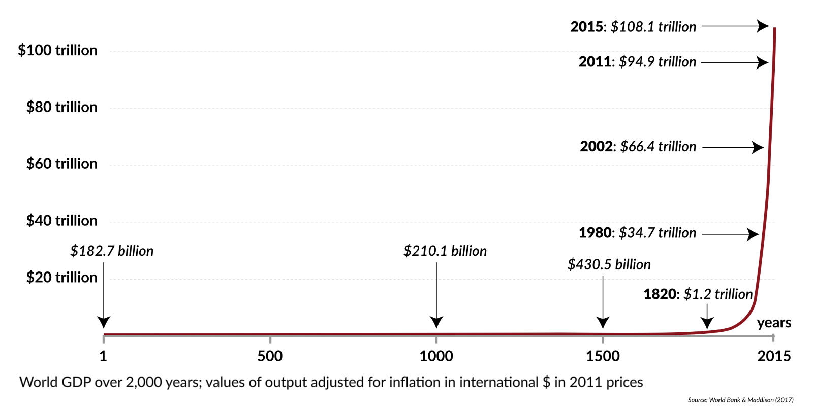 Our hunter-gatherer ancestors experienced functionally zero economic growth — life was simply a matter of survival, dependent on nomadically tethering oneself to the movement of wild animal herds. Then, about 10,000 years ago, we figured out the basics of agriculture and, later, animal husbandry, which allowed humanity to begin eking out the barest subsistence. This created some amount of consistency and certainty in daily life, which then required developing institutions and systems for managing time-spatial relationships. The result was the emergence of more complex social arrangements, like religion and government.