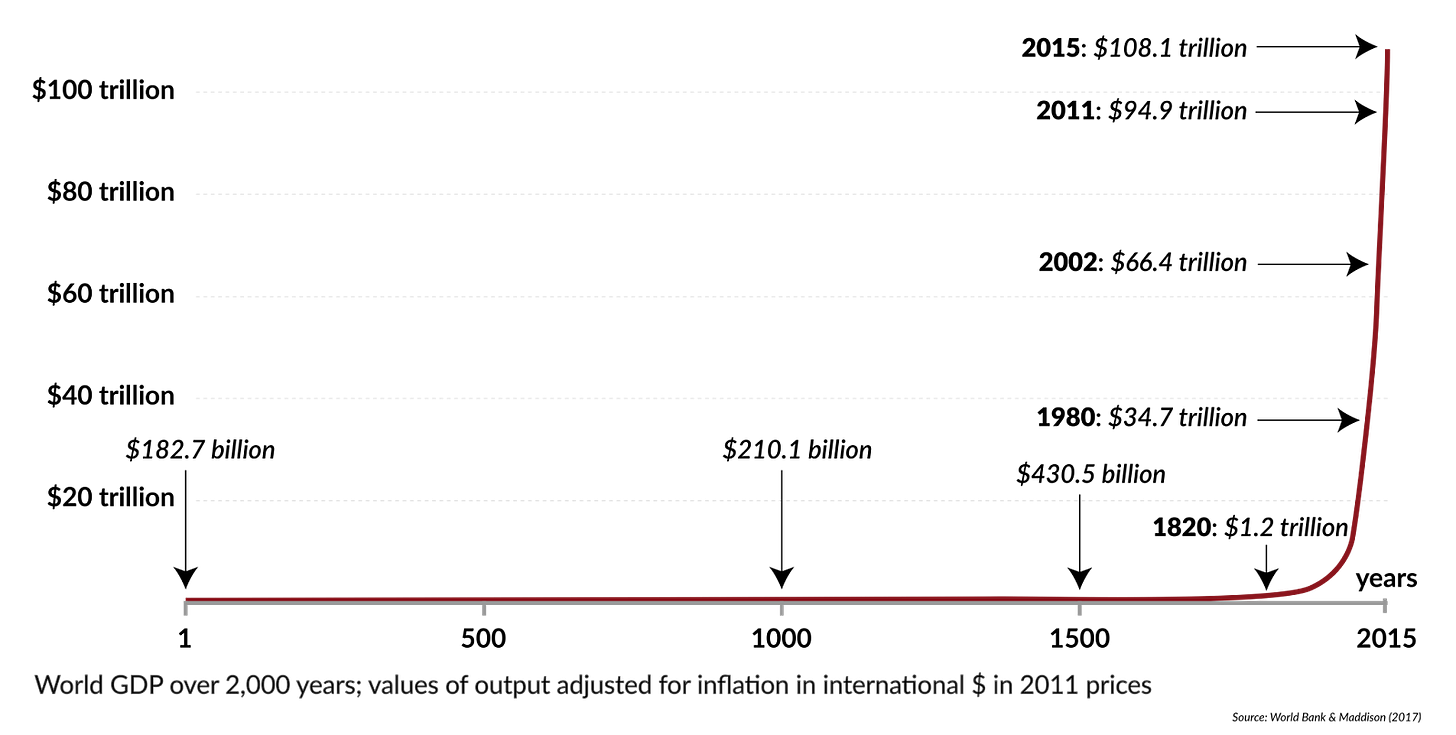 But after the Agricultural Revolution, growth stalled again and humanity settled into thousands of years of more marginal improvements in economic growth.